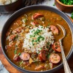 This Authentic Cajun Sausage and Chicken Gumbo recipe delivers a rich and hearty dish bursting with traditional Cajun flavors. Slow-cooked with a deeply browned roux, smoky andouille sausage, tender chicken thighs, and the classic ‘holy trinity’ of vegetables, this gumbo offers a soul-warming meal perfect for sharing with family and friends.