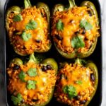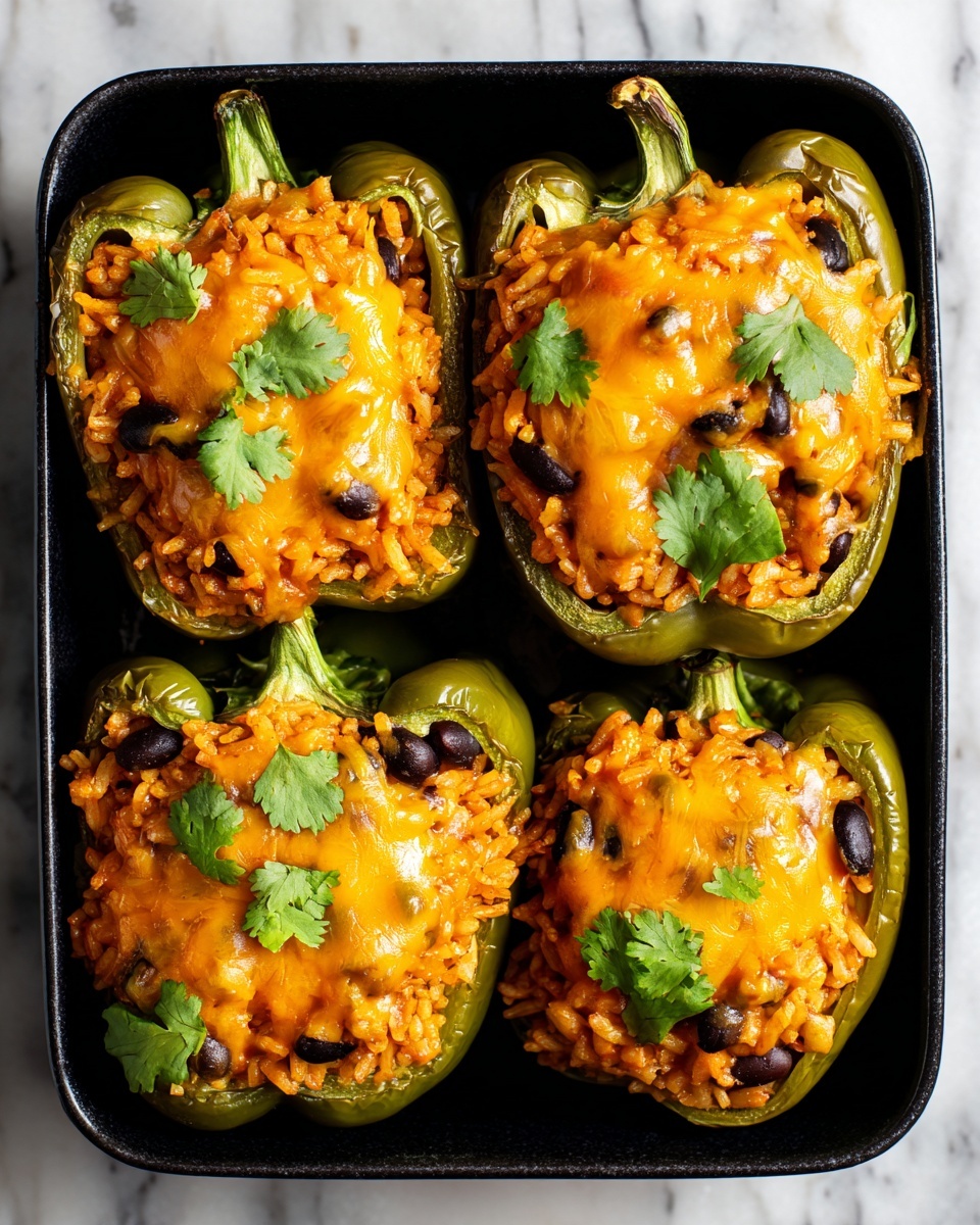 Delicious baked stuffed poblano peppers filled with a savory mix of ground turkey or beef, rice, black beans, corn, and spices. Topped with melted cheddar or Monterey Jack cheese, these Mexican-inspired stuffed peppers are perfect as a hearty main dish, garnished with fresh cilantro and lime wedges for a burst of freshness.