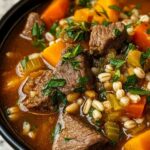 Reheat your Beef Barley Soup Recipe on the stovetop over medium heat, stirring occasionally to ensure even warming. If it thickens too much, add a splash of water or broth to loosen the consistency. Microwaving works well too, but just be sure to heat it thoroughly and stir halfway through for the best results.