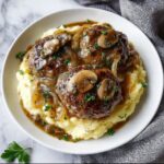 Bobby Flay Salisbury Steak with Mushroom Gravy is a classic American comfort food featuring juicy ground beef patties simmered in a rich and savory mushroom gravy. The dish combines flavorful seasonings, tender mushrooms, and a smooth gravy that’s perfect served over mashed potatoes or rice for a hearty family meal.