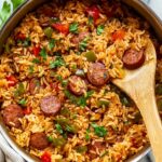 - Rest and Serve: Remove the skillet from heat but keep it covered. Let the dish rest for 5 minutes to allow flavors to meld and the rice to finish cooking. After resting, uncover the skillet and gently fold the sausage and rice together to redistribute evenly. Garnish with sliced green onions and serve hot.