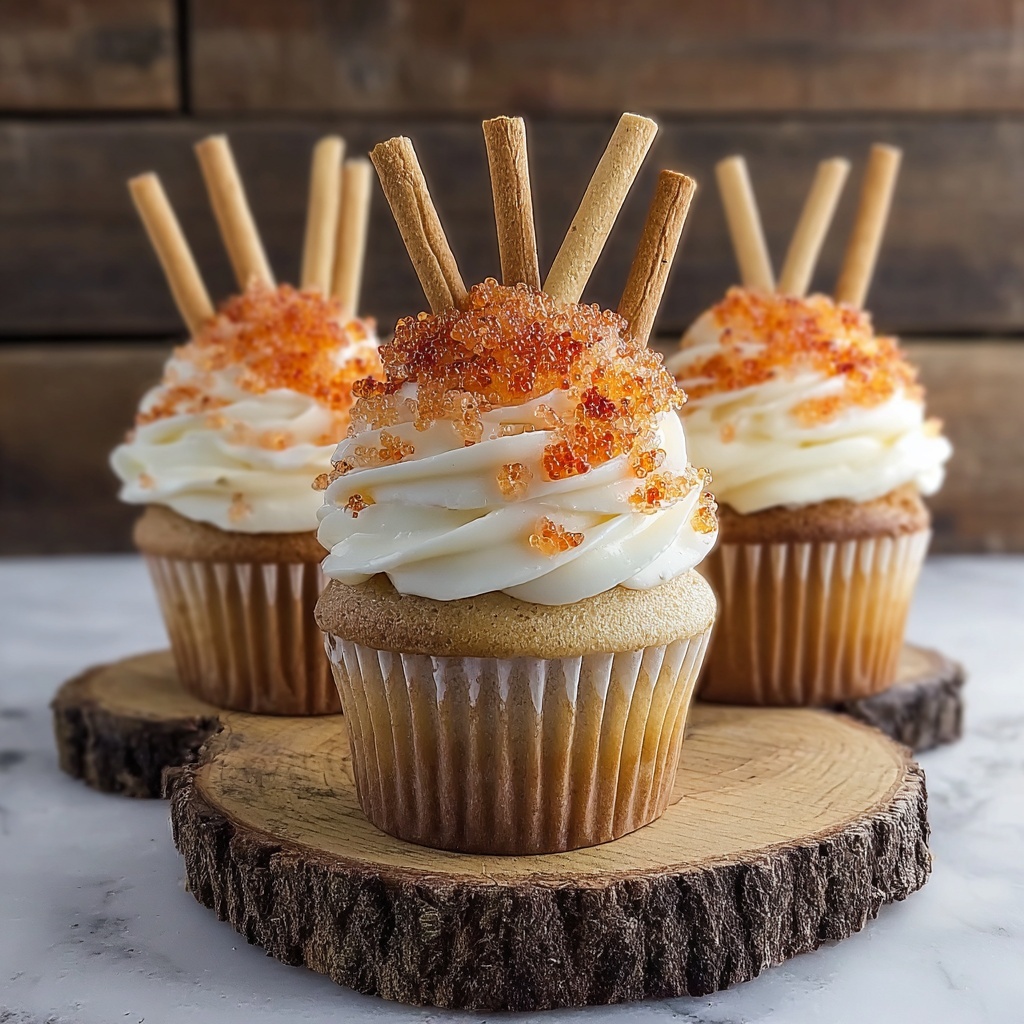 Camp Fire Cupcakes are a fun and creative dessert inspired by the classic campfire experience. Moist French Vanilla cupcakes topped with a rich buttercream frosting are decorated with graham cracker crumbs, cocoa powder, pretzel rods, and mini marshmallows to mimic a cozy campfire scene. Perfect for parties, camping-themed events, or any festive occasion.
