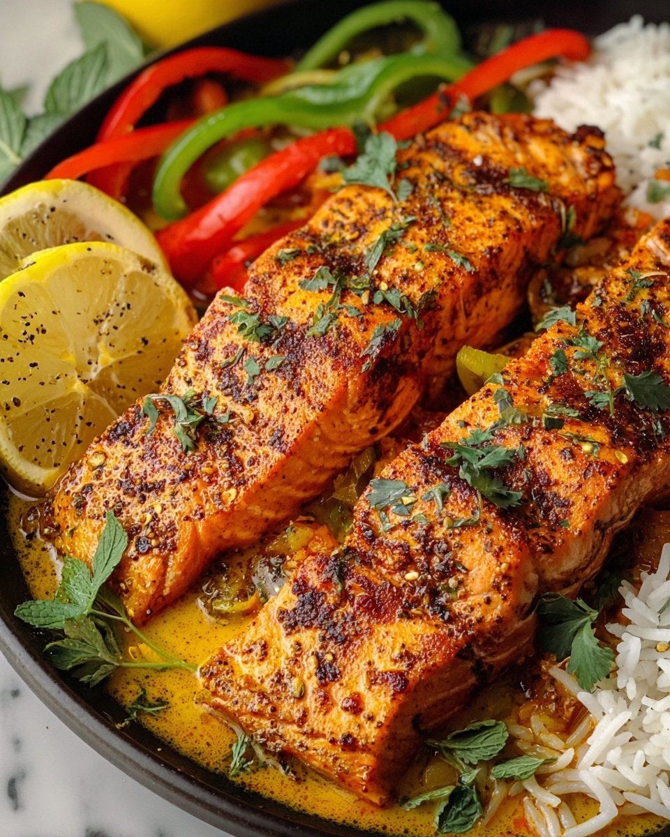 This Caribbean Coconut Curry Salmon recipe combines tender, seared salmon fillets with a rich and aromatic coconut curry sauce infused with Caribbean spices, bell peppers, and fresh herbs. Perfect for a flavorful tropical-inspired dinner that comes together in under an hour, delivering a balanced dish of protein and vibrant, mildly spicy flavors.