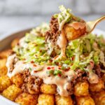 - Add Toppings: Remove the baking sheet carefully from the oven. Drizzle or dollop hamburger sauce over the hot cheesy tots, then add sliced pickles and shredded lettuce for a fresh crunch.