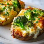 These Cheesy Broccoli Twice-Baked Potatoes are a comforting and delicious side dish featuring fluffy russet potatoes filled with a creamy mixture of sour cream, butter, steamed broccoli, and sharp cheddar cheese. Baked to golden perfection, they make a perfect hearty addition to any meal.