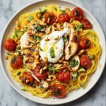 If you’re craving a dish that feels both indulgently comforting and wonderfully fresh, look no further than this Chicken Spaghetti with Burrata, Roasted Cherry Tomatoes, and Lemon Butter Garlic Sauce Recipe. Picture tender, smoky chicken nestled among perfectly al dente spaghetti, tossed with a bright, silky lemon butter garlic sauce, and topped with creamy burrata cheese that melts into every bite. The roasted cherry tomatoes add a sweet, caramelized pop that elevates the entire experience, while fragrant basil and toasted pine nuts bring vibrant herbal notes and a satisfying crunch. This recipe is a delightful balance of textures and flavors that will quickly make it a staple in your dinner rotation.