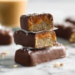 - Chocolate topping and set: Melt 250 g vegan dark chocolate gently over a double boiler or microwave until smooth. Pour the melted chocolate over the layered mixture and spread evenly. Sprinkle a pinch of sea salt on top. Refrigerate the pan for at least 2 hours or until the bars are firm and set. Once solidified, cut into 18 bars and serve.