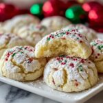 - Decorate Cookies: Place the coated dough balls on the prepared baking sheet, spacing them about 2 inches apart. Press a few red and green sprinkles lightly onto the top of each ball for a festive touch.