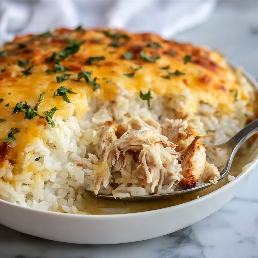 This creamy chicken and rice casserole is a comforting, hearty dish perfect for family dinners. Tender cubed chicken and uncooked long-grain rice are baked together in a rich mixture of chicken broth and cream of celery soup, then topped with melted cheddar cheese for a luscious, cheesy finish.
