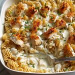 This Creamy Garlic Parmesan Chicken Pasta Bake is a rich, comforting dish perfect for a family dinner. Featuring tender rotini pasta tossed with tender cooked chicken, creamy Alfredo and garlic Parmesan sauces, and topped with gooey melted mozzarella and Parmesan cheeses, this baked pasta casserole is both hearty and indulgent. It’s easy to prepare, combining cooked ingredients with simple seasoning before baking to golden, bubbly perfection. Garnish with fresh parsley for a touch of freshness and color.