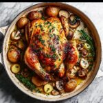 This Creamy Lemon and Herb Pot Roasted Chicken recipe features a whole chicken roasted to perfection with fresh herbs, lemon, and garlic, then simmered in a rich, creamy sauce with baby potatoes. The dish combines roasting and stovetop simmering for a flavorful, comforting meal perfect for a family dinner.
