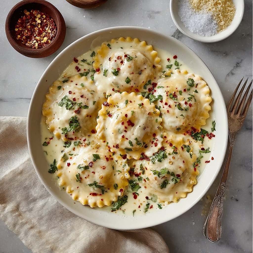 If you want to impress your guests, try plating the ravioli in shallow wide bowls with a sprinkle of basil chiffonade on top and a twist of freshly cracked pepper. Serving the sauce in a small ladle alongside allows everyone to add as much creaminess as they want. It’s these little touches that turn a simple dish into an experience.