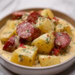 A comforting and creamy crockpot dinner featuring smoky sausage, tender baby potatoes, and a flavorful mixture of herbs and cream, perfect for an easy and hearty meal.
