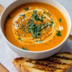 This Creamy Tomato Soup with Grilled Cheese Sandwich is a comforting classic, perfect for a cozy meal. The smooth, rich tomato soup is enhanced with a touch of cream and aromatic herbs, paired perfectly with a crispy, cheesy grilled sandwich made with golden toasted bread and melted cheddar cheese.