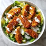 Chop the romaine lettuce and toss it with half of your chilled dressing, coating every leaf with creamy goodness. On a large serving platter or bowl, layer the dressed romaine lettuce first. Then add the crispy chicken tenders (cut into bite-sized pieces), sprinkle the croutons generously for crunch, and crown it all with shaved Parmesan cheese. Drizzle more dressing on top if you like. This assembly promises a perfect harmony of texture and flavor in every forkful.