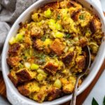 This stuffing pairs wonderfully with traditional holiday mains like roasted turkey or baked ham. For a lighter meal, serve it alongside roasted vegetables or a crisp green salad tossed in a tangy vinaigrette, which balances the richness of the stuffing.