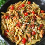 - Combine Everything: Return the cooked chicken to the skillet. Add the drained pasta and toss everything together to coat in the creamy sauce. If the sauce is too thick, add some of the reserved pasta water a little at a time until desired consistency is reached.