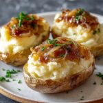These French Onion Twice Baked Potatoes combine the rich, caramelized flavors of French onion soup with the comforting texture of twice baked potatoes. Perfect as a hearty side or a satisfying vegetarian main, these potatoes are filled with a creamy mixture of caramelized onions, sour cream, beef broth, and Gruyère cheese, then baked again until golden and bubbly.