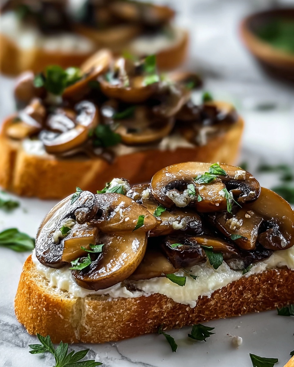 - Assemble and serve: Spoon the garlic mushroom mixture evenly over each toasted bread slice. Optionally, sprinkle with grated Parmesan, crumbled goat cheese, and garnish with chopped parsley. Serve warm.