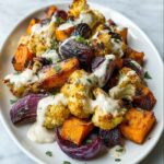 Gather all your chopped veggies — cauliflower florets, sweet potato pieces, red onion strips, and carrot chunks — and spread them evenly on a large sheet pan. This arrangement allows the heat to circulate around each piece, promoting even roasting and that irresistible slight crisp on the edges.