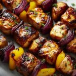 These Hawaiian Chicken Skewers are a vibrant and flavorful dish featuring marinated chicken, colorful bell peppers, red onion, and sweet pineapple chunks. The chicken is marinated in a tangy and slightly spicy mixture of soy sauce, pineapple juice, brown sugar, and fresh lime juice, then grilled to juicy perfection. Perfect for a summer barbecue or a tropical-themed meal, these skewers deliver a wonderful balance of savory, sweet, and zesty flavors with a smoky char from the grill.