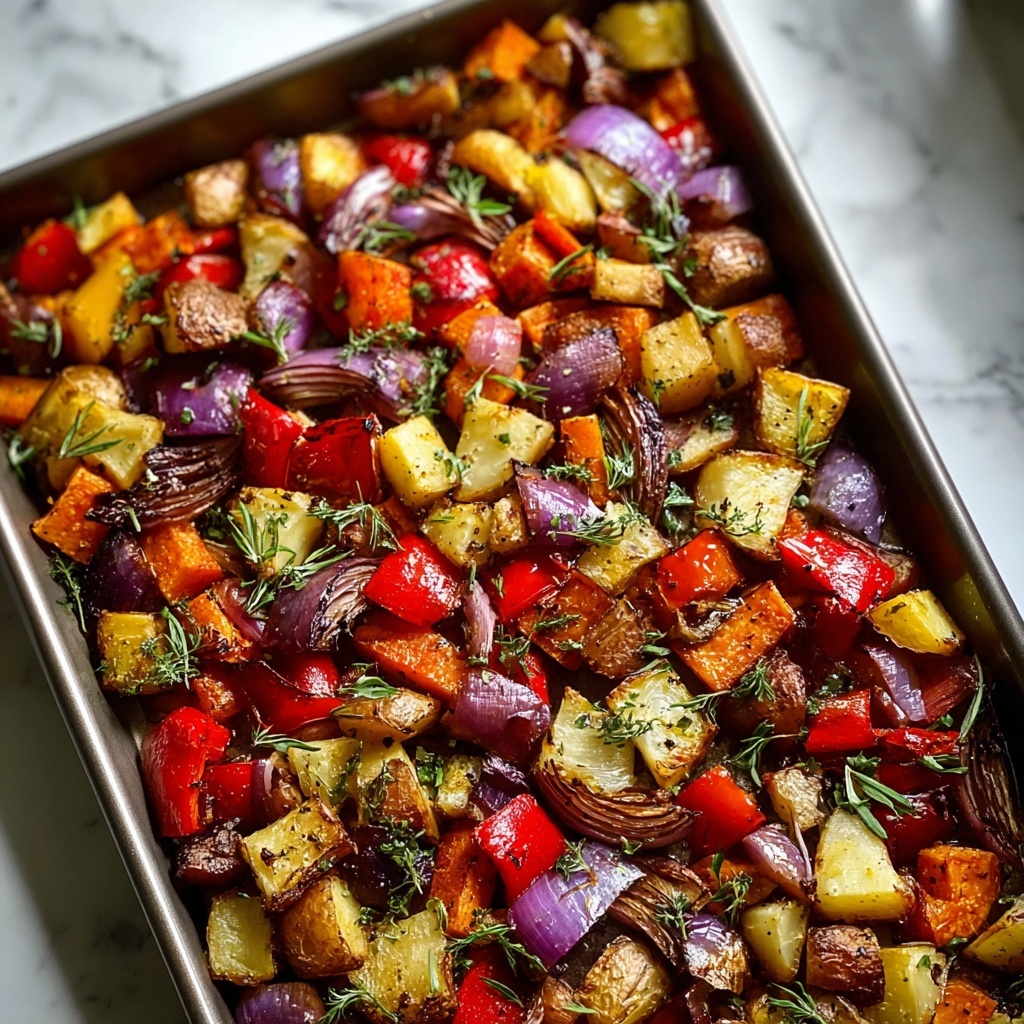 A flavorful and wholesome sheet pan vegetable roast featuring a colorful medley of bell peppers, zucchini, sweet potatoes, and red onions seasoned with garlic, thyme, and oregano, perfect for an easy and nutritious side or main dish.
