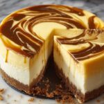 In a small bowl, combine the caramel sauce with the additional ¼ cup of heavy cream for a fluid texture perfect for swirling. Pour the cheesecake filling gently over the cooled crust, then drizzle the caramel mixture evenly over the surface. Using a toothpick or knife, delicately swirl the caramel through the filling to create an eye-catching marbled effect that’s as lovely to look at as it is delicious.
