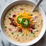 This Jalapeno Popper Chicken Soup is a creamy, spicy, and comforting dish inspired by the flavors of jalapeno poppers. It combines crispy bacon, tender chicken, sharp cheddar, and a touch of heat from jalapenos in a rich broth, perfect for a cozy meal.
