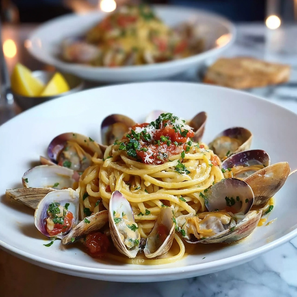 This classic Italian seafood pasta features tender littleneck clams simmered in a savory white wine and tomato sauce, tossed with perfectly cooked linguine and fresh herbs. It’s a delightful, flavorful dish that balances the briny sweetness of clams with garlic, cherry tomatoes, and a hint of red pepper flake for warmth, making it an elegant yet simple meal perfect for any occasion.