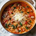 This Marry Me Sausage Orzo Soup is a hearty and flavorful Italian-inspired dish featuring savory Italian sausage, tender orzo pasta, fresh vegetables, and a rich tomato broth. Perfect for a cozy family dinner, it combines simple ingredients with aromatic herbs and fresh spinach to create a comforting and satisfying soup in just 35 minutes.