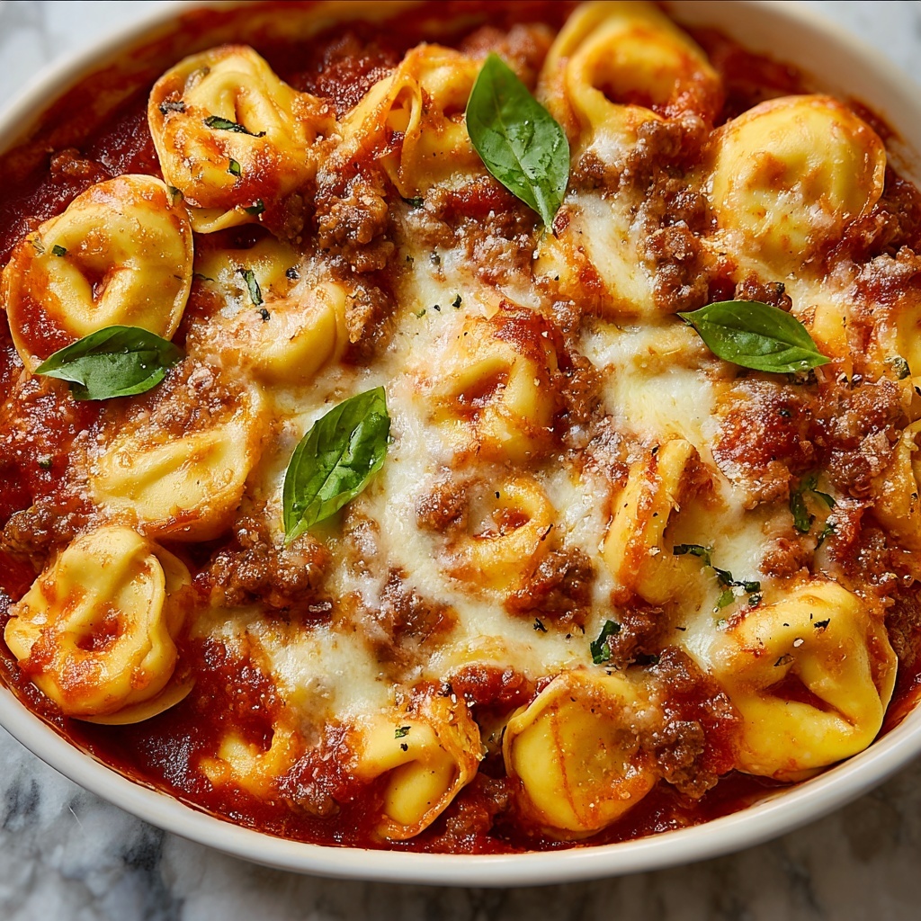 Drain any excess grease from the meat mixture, then return it to the skillet. Pour in the pizza sauce and gently fold in the cooked tortellini until everything is evenly coated. Bring the skillet to a simmer so the sauce thickens slightly and the tortellini absorb those rich flavors.