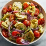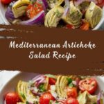 A refreshing and tangy Mediterranean Artichoke Salad featuring artichoke hearts, cherry tomatoes, chickpeas, and capers, tossed in a zesty lemon-Dijon olive oil dressing. Perfect as a light lunch or side dish, this salad combines vibrant flavors and simple ingredients for a healthy, no-cook Mediterranean delight.