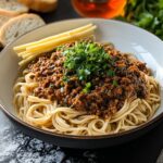 A flavorful and easy-to-make Mongolian Ground Beef Noodles recipe combining tender noodles with savory ground beef cooked in a rich sauce, fresh vegetables, and a touch of heat, all garnished with toasted sesame seeds for a delightful Asian-inspired meal.