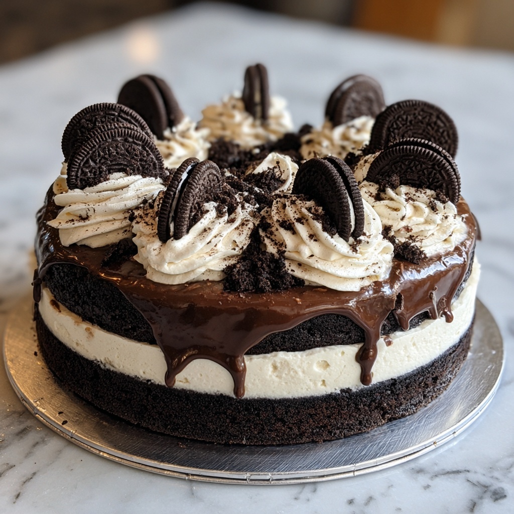 A delicious and easy-to-make Oreo Ice Cream Sandwich Cake featuring a crunchy Oreo cookie crust, creamy vanilla ice cream filling, and a luscious chocolate ganache topping, perfect for a refreshing dessert that serves 12.