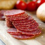 7. Arrange Pepperoni: Place the sliced pepperoni evenly across the cheese. For crispier pepperoni, slightly overlap the slices.