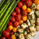 - Serve: Transfer the combined chicken, cherry tomato, and tortellini mixture onto the serving plate with the asparagus. Serve warm and enjoy a colorful, flavorful meal.