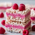 Delicious Raspberry and White Chocolate Rice Krispie Bars featuring a gooey marshmallow base, crunchy puffed rice, tart freeze-dried raspberries, and a decadent white chocolate drizzle. Perfect for a sweet treat or party snack that sets quickly and is easy to make.