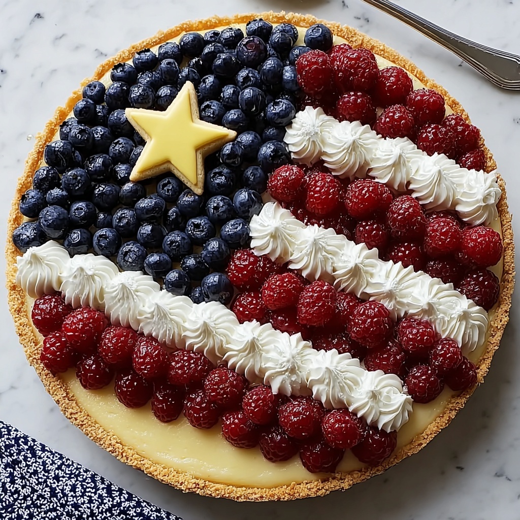 - Assemble the Flag Pizza: Spread the cream cheese mixture evenly over the cooled cookie crust. Arrange fresh raspberries and blueberries on top in the pattern of the United States flag—blueberries grouped in the top left corner to represent the stars section and raspberries arranged in stripes across the surface.