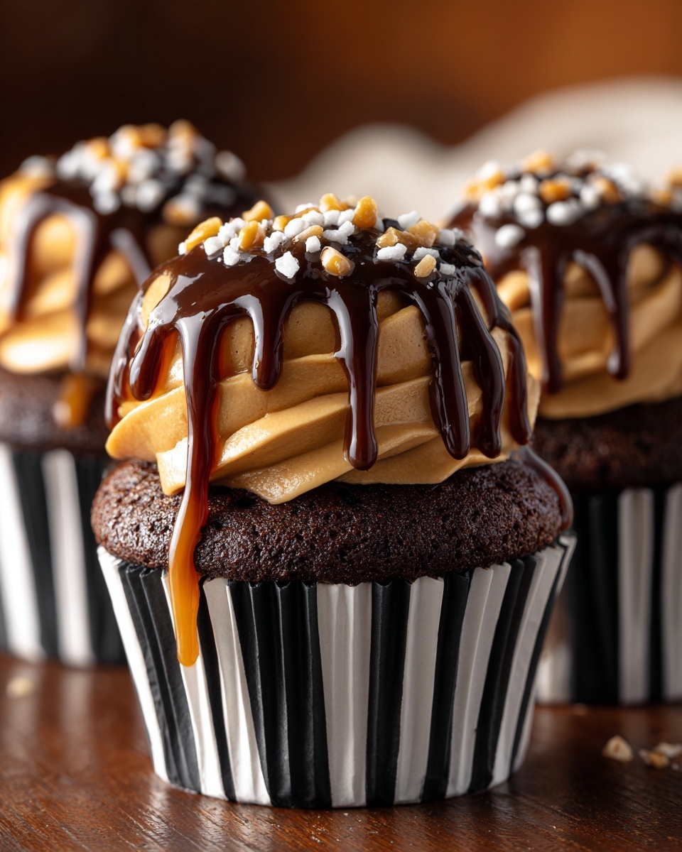 These cupcakes pair beautifully with a scoop of vanilla bean ice cream or a dollop of whipped cream to balance their richness. For drinks, try a bold coffee or a creamy latte to complement the chocolate and caramel notes perfectly.