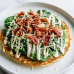 Once cooked, remove the tacos from the skillet and layer them with fresh romaine lettuce, a generous drizzle of Caesar dressing, a sprinkle of grated parmesan cheese, and crispy bacon bits. You can toss the Caesar salad ingredients together in advance for an easy assembly or just pile each element one by one for a fun taco-building experience.