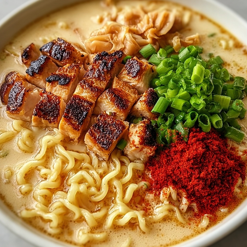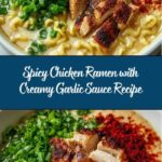 A flavorful and comforting Spicy Chicken Ramen featuring tender marinated chicken, perfectly cooked instant ramen noodles, and a rich, creamy garlic sauce, garnished with fresh green onions. This dish balances heat and creaminess for a satisfying meal ready in under an hour.