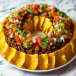 This Spicy Ground Beef Taco Ring is a delicious and visually appealing dish perfect for parties or family dinners. Ground beef is seasoned with taco spices, cooked with onion and garlic, then layered on crescent roll dough with melted cheddar and Monterey Jack cheeses. Baked until golden, this taco ring is garnished with fresh tomatoes, olives, and cilantro, served with sour cream and salsa for a flavorful Mexican-American main course or appetizer.