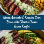 A vibrant and flavorful Steak, Avocado & Roasted Corn Bowl featuring tender sliced flank steak, smoky roasted corn, creamy avocado, and a zesty cilantro cream sauce. Perfect for a quick, nutritious meal served over quinoa or brown rice for added heartiness.