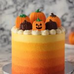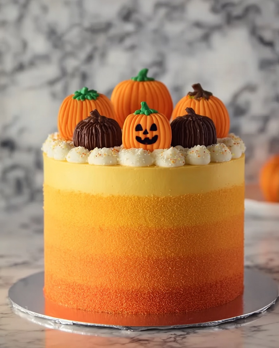 - Stencil Decoration: After chilling, place a parchment paper stencil on the cake surface. Apply sanding sugar in an ombre pattern from white to gold, yellow, and orange hues. Cover the top of the cake with orange sanding sugar to create a Halloween-inspired colorful finish.