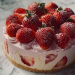 While fresh strawberries are best for maintaining texture and color, you can use frozen strawberries if thawed and patted dry thoroughly to avoid extra moisture that may affect the cake’s structure.
