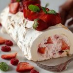 - Garnish and Serve: Garnish the roulade with additional whipped cream and fresh strawberries as desired. Slice and serve immediately to enjoy the delicate balance of crisp meringue, creamy filling, and fresh fruit.