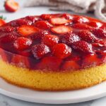 Allow the cake to cool in the pan for about 10 minutes, making it easier to handle. Then carefully run a knife around the edges and flip it out onto a serving plate. Remove the parchment paper to reveal the glossy strawberry topping. Let it cool completely before slicing to let the flavors fully settle.