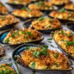 Delicious Italian-style stuffed baked mussels featuring fresh mussels topped with a savory mixture of garlic, breadcrumbs, Parmesan cheese, and fresh herbs, baked to golden perfection. A perfect seafood appetizer that combines tender shellfish with a crispy, flavorful crust.
