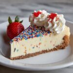 - Add toppings and serve: Once chilled, remove the cheesecake from the springform pan, top with whipped cream and optional sprinkles for decoration, then slice and serve.