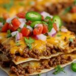 - Assemble the Mexican Pizzas: Top the bean-spread tortillas with the seasoned ground beef, then cover each with another fried tortilla to create a ‘pizza’ base.